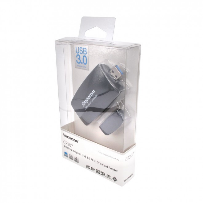 Transfer photos and video faster with Simplecom CR307 All-in-One USB 3.0 card reader. Based on USB 3.0 interface transfer performance of up to 5Gbps, this card reader reduces transfer time when downloading data from card to computer. Outfitted with four card slots, this compact solution supports all major card formats and it’s also backwards compatible with USB 2.0 devices. Unleash the full potential of your high-speed memory cards with the Simplecom CR307 USB 3.0 card reader.