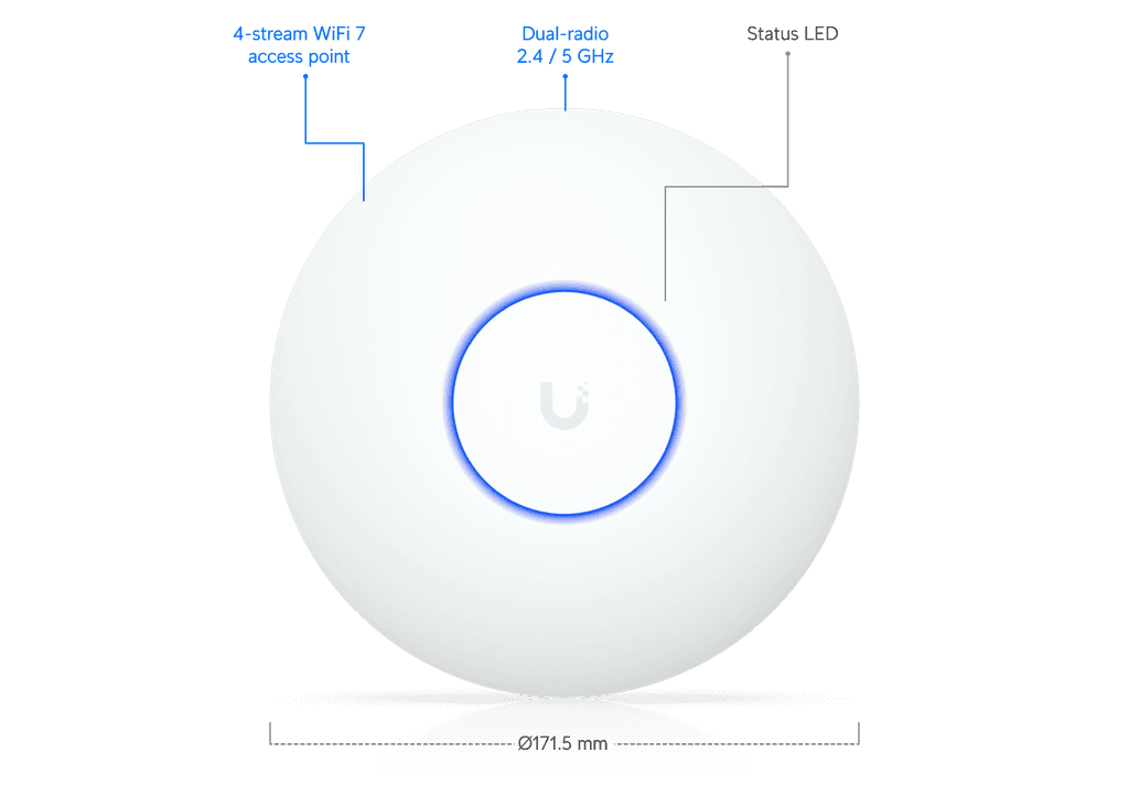 Compact, ceiling-mounted WiFi 7 AP with 4 spatial streams and 2.5 GbE uplink.